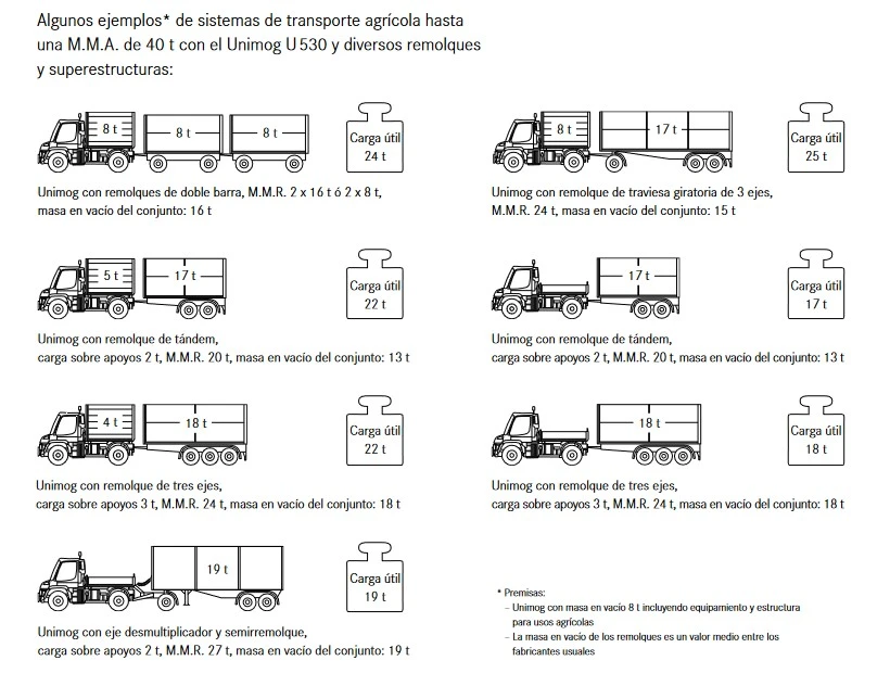 Hasta 40 t de peso total del conjunto con el Unimog U 530 en función del remolque y la superestructura.
