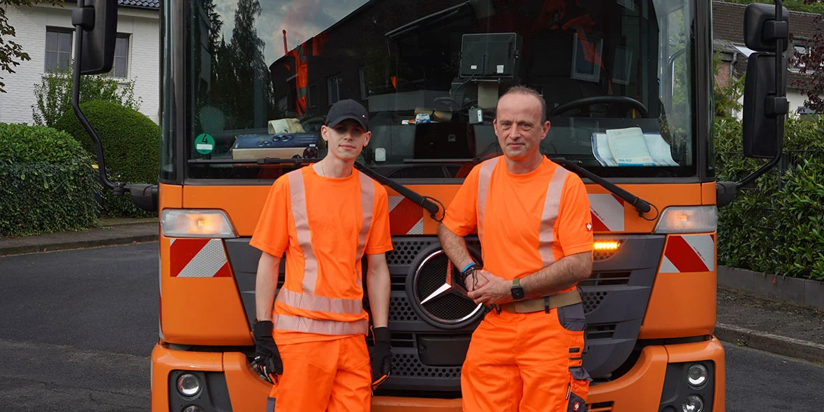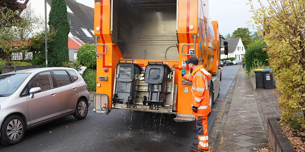 Frank et Alexander, deux employés de MoWa, se déplacent dans le quartier de Düsseldorf-Unterbach. Ils n’acceptent aucune poubelle sale. Avec leur Econic, ils suivent les éboueurs à des intervalles d’environ 15 minutes pour s’attaquer ensuite à ce qui est resté dans les poubelles. Avec de l’eau chaude et une haute pression.
