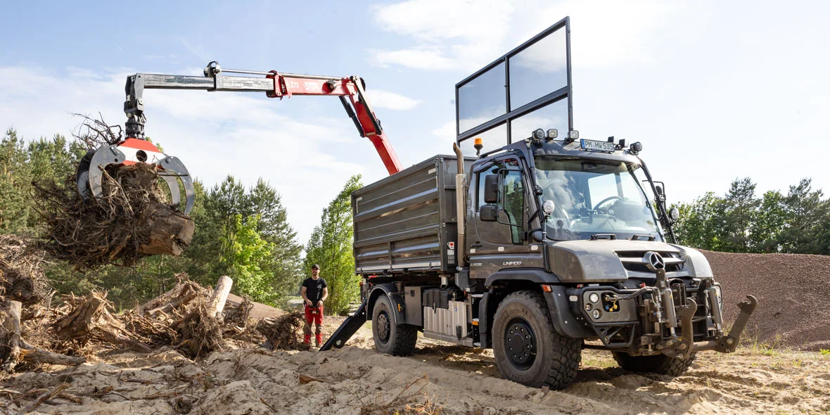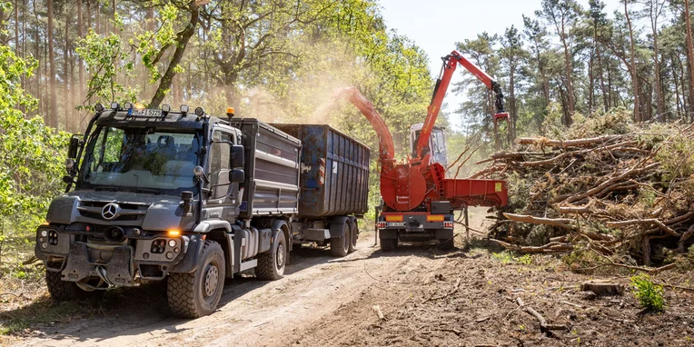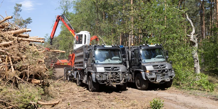 Jusqu'à présent, les arbres leur ont toujours permis de voir la forêt, car après tout, la forêt est leur employeur. Paul Wolf et Fabian Freisleben sont des professionnels lorsqu'il s'agit de bois : Abattage d'arbres, entretien de bosquets, bois de chauffage, copeaux de bois. Et : Sans équipement lourd, ils seraient perdus. Parce que Paul Wolf et Fabian Freisleben sont attachés à la qualité - tant au niveau des équipements que de leur travail - ils ont récemment mis en service leur deuxième Unimog U 535.