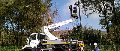 Le système hydraulique doit encore élever de quelques centimètres la dernière partie de la grue Palfinger pour que Michael Leiber puisse commencer son travail dans la nacelle. La ligne de 20 KV a été coupée et mise à la terre depuis un certain temps. Rapidement, l'installateur retire les fixations et détache les câbles électriques des isolateurs. Le pylône est en fin de vie. Il doit être remplacé par un pylône fabriqué dans un matériau de substitution du bois. Le contrôleur signale qu'il est pourri en y plantant des clous rouges.