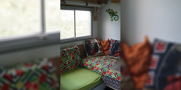 Sonja : Oui, ce n'est pas toujours agréable d'être dehors lors d'un voyage de ce type. Soit il fait trop chaud soit on est couvert de piqûres d'insectes. Le problème était que nous devions toujours prendre une décision avant de commencer l'aménagement : table ou lit. Et les travaux de transformation sont énervants à la longue. J'ai donc dit. Nous commençons par découper les coussins lombaires, ensuite nous diviserons la table en deux. Ainsi, nous pouvons avoir simultanément la moitié d'un lit ainsi que deux places assises et une partie de la table.‘ Au final, c'était très confortable.