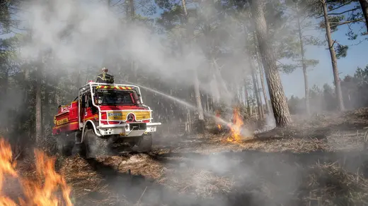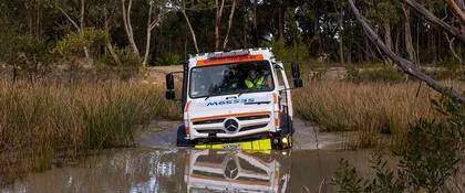 Le passage de la pompe Mammut mobile peut atteindre 80 cm d’épaisseur. « Les branches et les tuiles passent sans problème », explique Axel Marx. « La flexibilité du véhicule nous a convaincus de proposer ce système sur l’Unimog. L’Unimog est rapide, il prend peu de place, il a une profondeur de gué gigantesque et, dans notre cas, il est totalement autonome, il peut prendre en charge lui-même le système de pompage au moyen d’une grue de chargement Palfinger. »