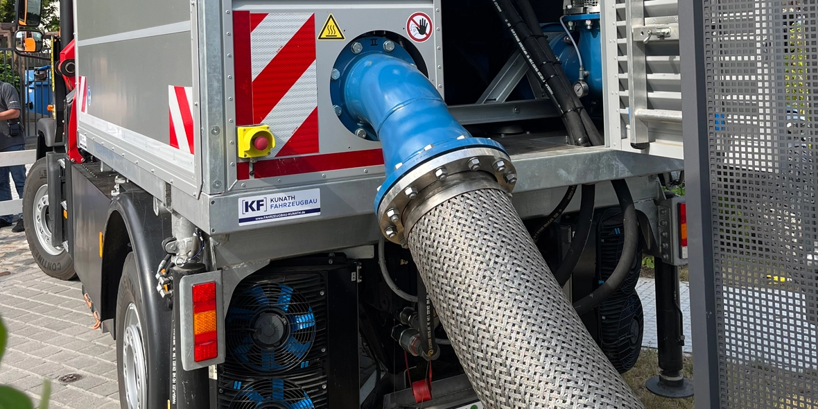 Conçu par des pionniers pour des pionniers : Les experts en gestion de l’eau du groupe wks de Dresde ont utilisé la puissance débordante d’un Unimog U 535 pour construire une pompe hydraulique mobile unique en son genre. Une invention d’une grande importance, car elle devrait permettre aux communes du monde entier de mieux faire face à la menace des inondations.