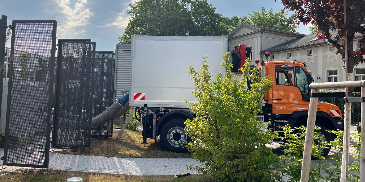 L’avantage de la solution développée par Axel Marx : En cas de besoin, l’Unimog équipé d’une gigantesque unité de soufflerie (2x 110 kW) sur une caisse mobile se rend sur la digue ou sur un dispositif similaire de protection contre les inondations le long du fleuve. Un tuyau d’air comprimé robuste y est raccordé à un tuyau fixe qui remonte de la canalisation. Et après : plein gaz !