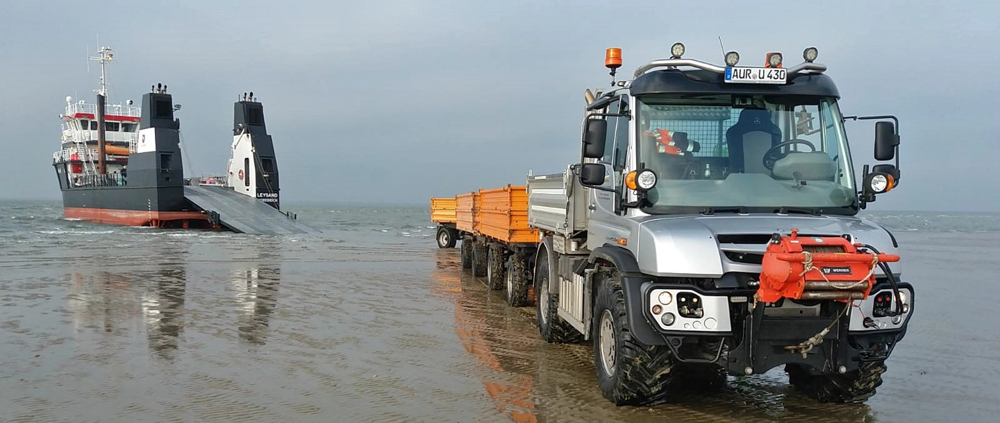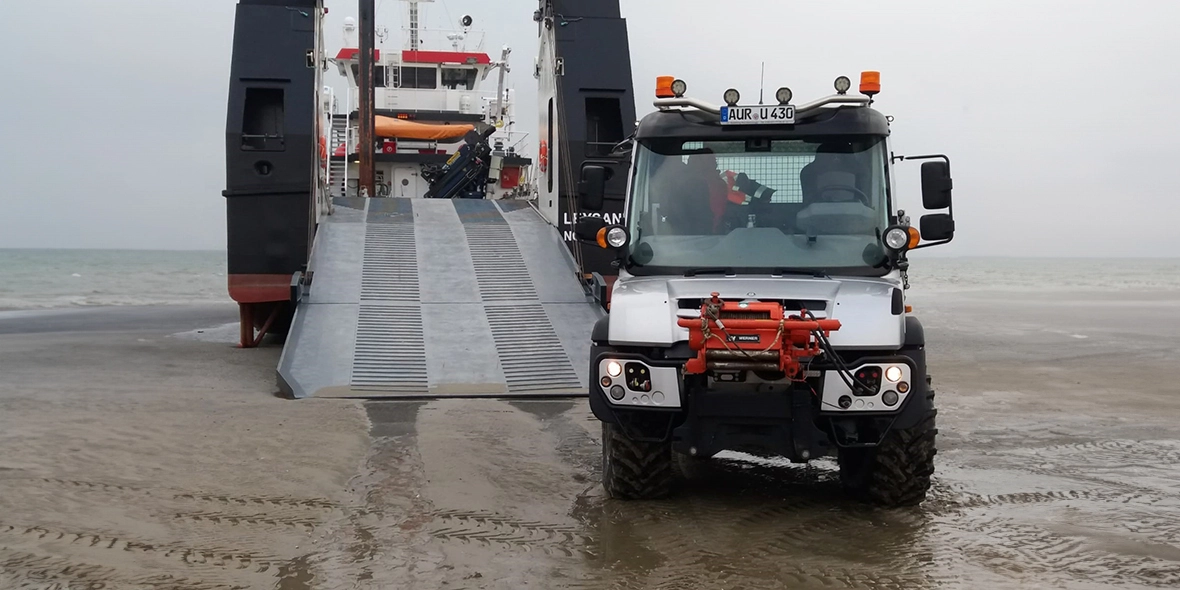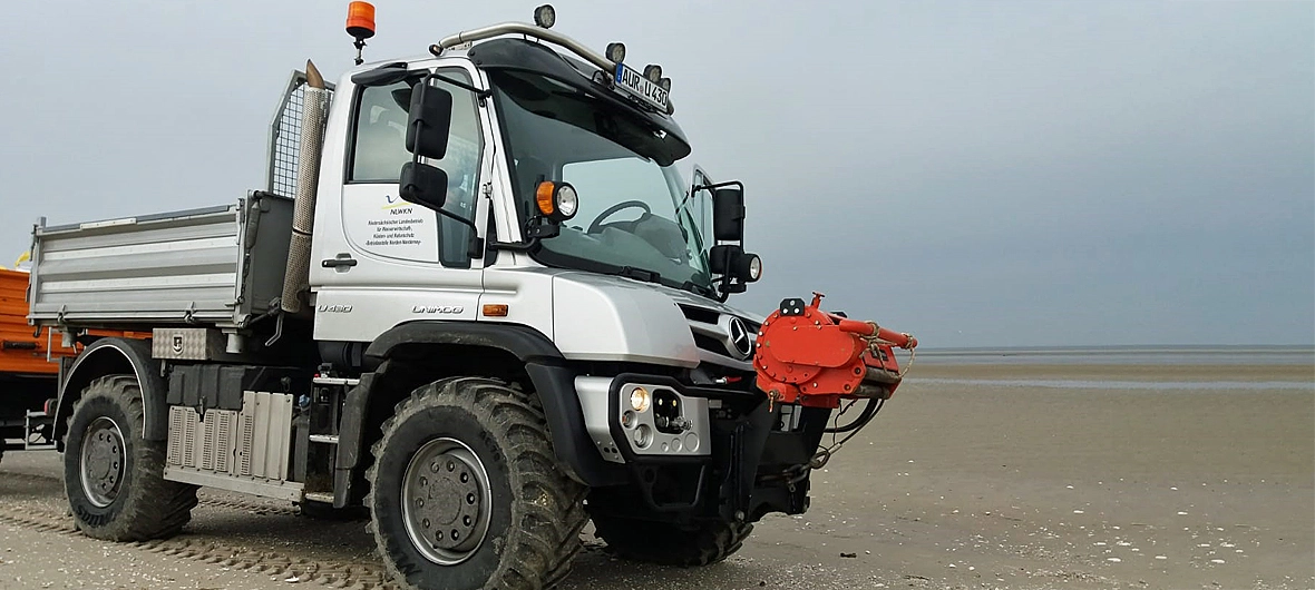 Il faut se méfier de l'eau qui dort : L’entreprise nationale de Basse-Saxe pour la gestion de l’eau, la protection des côtes et de la nature (NLWKN) est donc prête lorsque les vagues s’élèveront à nouveau dangereusement au-dessus des îles de Frise orientale – et menaceront un habitat unique pour l’homme et la nature. Lors de leurs préparatifs, les protecteurs côtiers peuvent compter sur un assistant fiable : l’Unimog U 430.