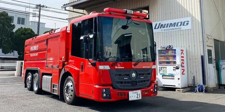 Assorti aux couleurs du drapeau national japonais et orné du symbole du soleil sur le front, un camion neuf rouge vermillon Econic 2635 L avec un réservoir de 10.000 l roule dans les rues de Tokyo. Sa mission : arriver plus rapidement et de manière plus flexible sur le lieu de l’incendie.