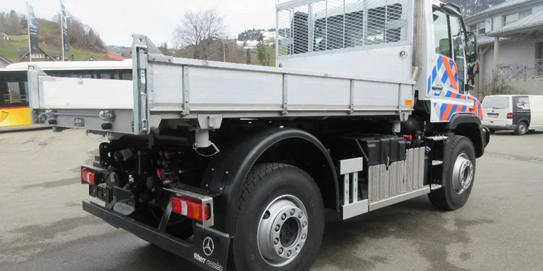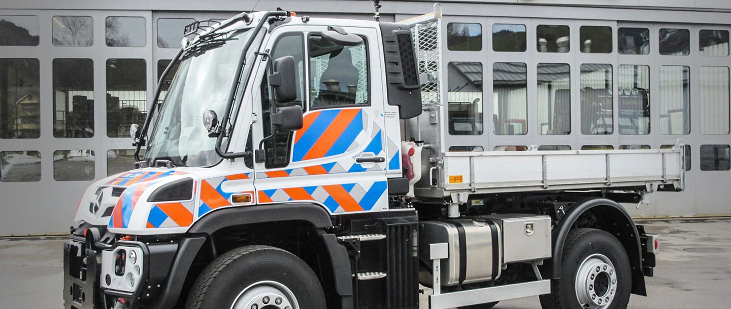 Oltre alla lama sgombraneve, al cospargitore di sale e alla fresa da neve, durante i mesi freddi i veicoli vengono equipaggiati, tra le altre cose, anche con una falciatrice montata nella parte anteriore, una gru nella parte posteriore e un verricello. «Prima di acquistare il nuovo portattrezzi, abbiamo redatto un capitolato contenente i requisiti tecnici da rispettare per rispondere alle nostre esigenze d'impiego. Per l'acquisto abbiamo fatto ricorso ad un bando pubblico – e l'Unimog portattrezzi si è piazzato al primo posto», spiega Jeannot Wagner.