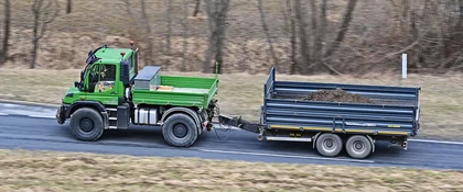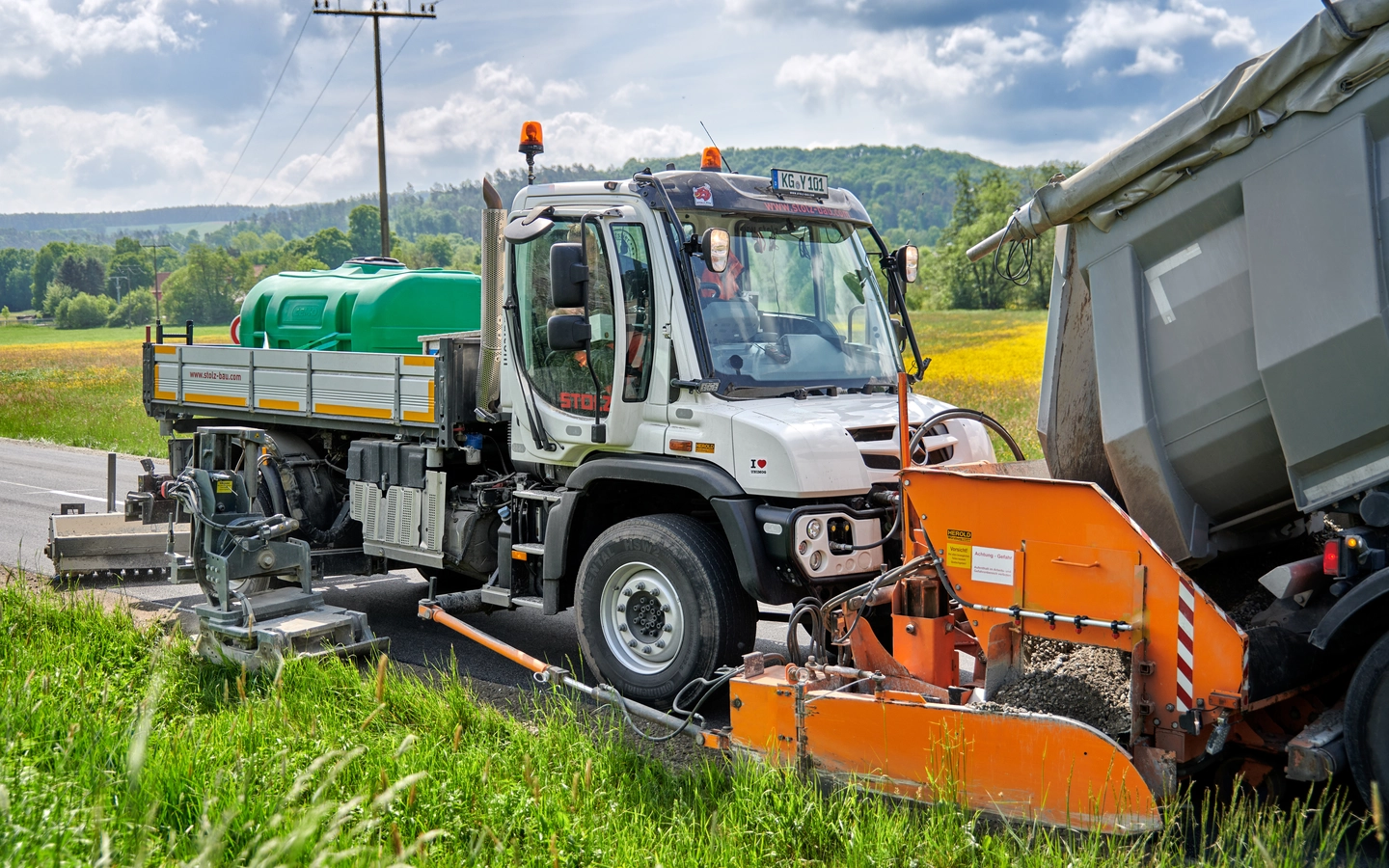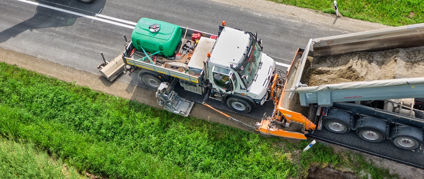 350 chilometri di strada all'anno: chi vuole fare questo passo, ha bisogno di macchine edili efficienti. Ecco perché Gebrüder Stolz GmbH & Co. KG di Hammelburg si affida all'aiuto di un vero tuttofare: l'Unimog U 530. Il porta-attrezzi assolve tra l'altro l'importante compito di una pavimentatrice e grazie alla sua versatilità si è rapidamente evoluto fino a diventare il veicolo preferito dai costruttori di strade.