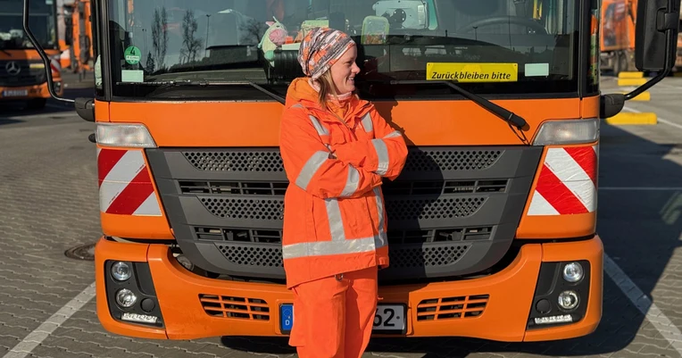 Mi piace guidare questo bolide per le strade. E le persone spesso mostrano sorpresa quando mi vedono al volante. Sa com'è, una donna al volante di questo enorme autocarro. In effetti è il primo autocarro che ho mai guidato, a eccezione dell'autocarro della scuola guida per prendere la patente. Anche quello era un veicolo Mercedes-Benz, ma era senza assi sterzanti, come nel caso della raccolta dei rifiuti.