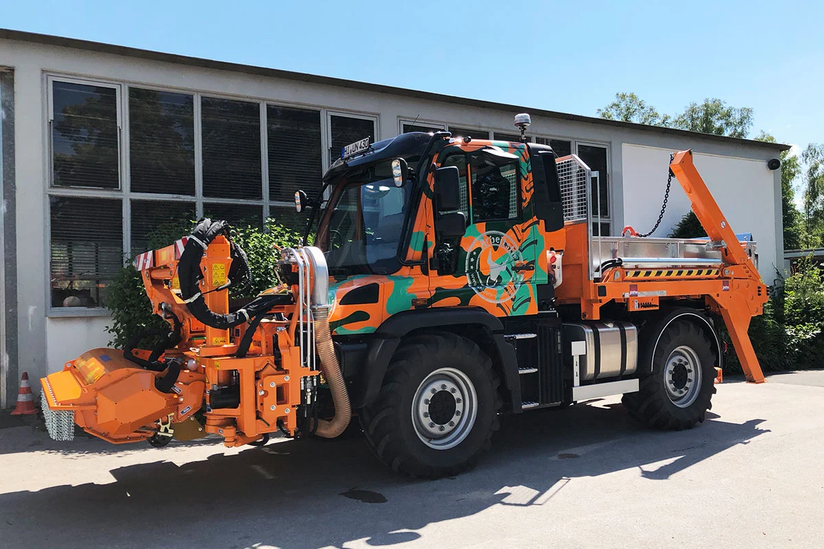 Negli esterni del veicolo trova conferma la versatilità d'impiego: «La pellicola riprende i colori tipici dei settori in cui viene impiegato l'Unimog», racconta Andreas Lein, che ha contribuito a scegliere i colori «mimetici» dell'Unimog U 430. L'arancione, utilizzato come base, rappresenta il settore municipale, il verde acceso il settore agricolo e il verde abete il settore forestale.