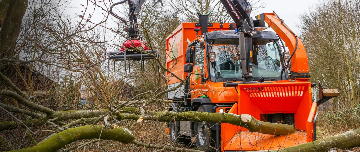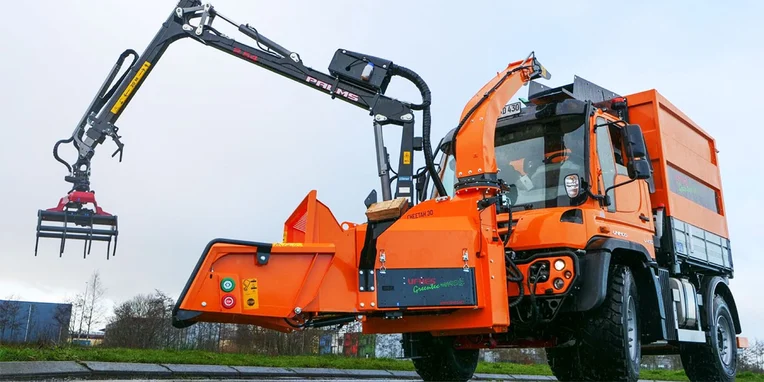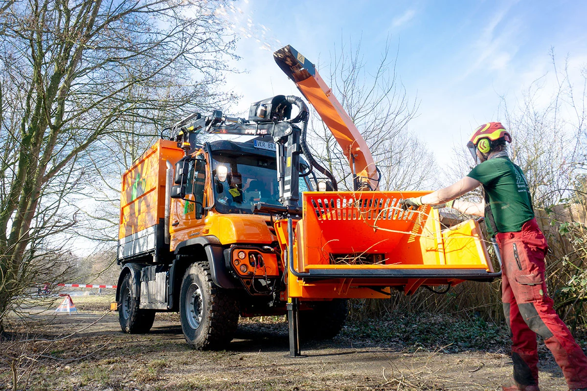 L'Unimog U 430 arancione è stato acquistato lo scorso dicembre. Lo Special Truck è dotato di sovrastruttura scarrabile e di una combinazione di equipaggiamenti amovibile realizzata dalla Ufkes Greentec, costituita da una cippatrice anteriore Cheetah 30 e da una benna per prelevare il legname. «Quando abbattiamo gli alberi o eseguiamo le operazioni di sgombero, possiamo triturare gli scarti del legno direttamente sul posto in modo da rendere il loro trasporto più agevole», spiega Maximilian Salzer illustrando l'utilizzo dell'Unimog durante gli interventi.