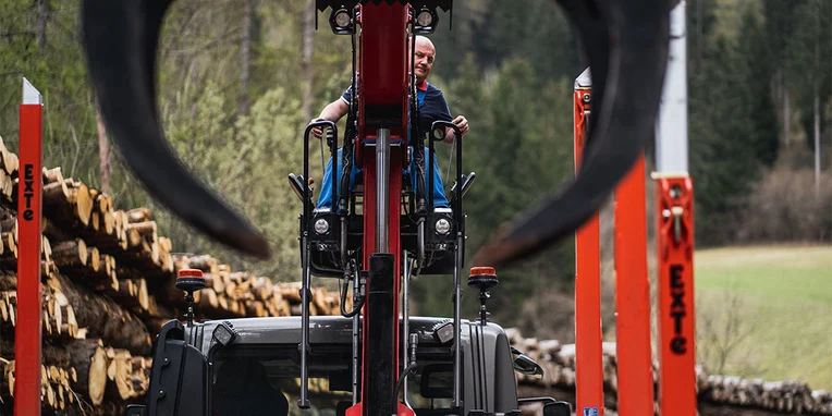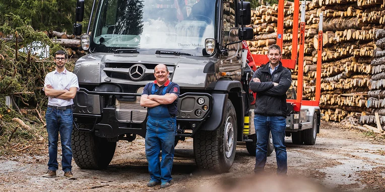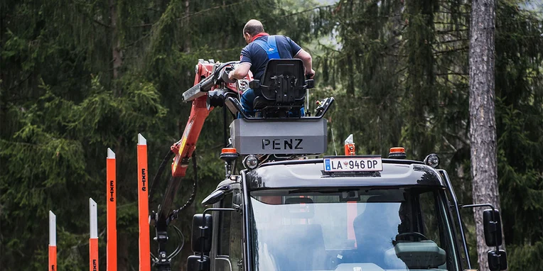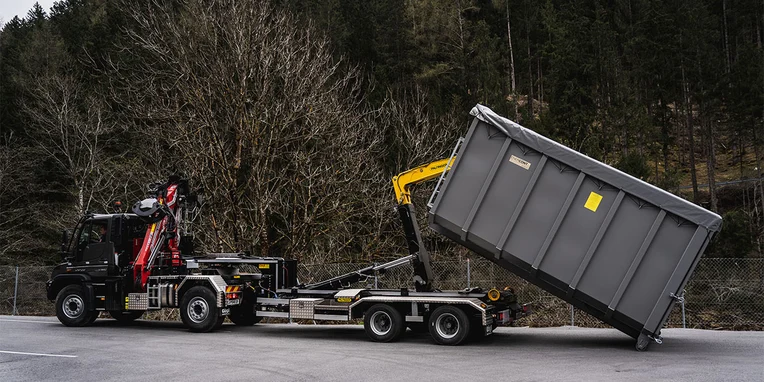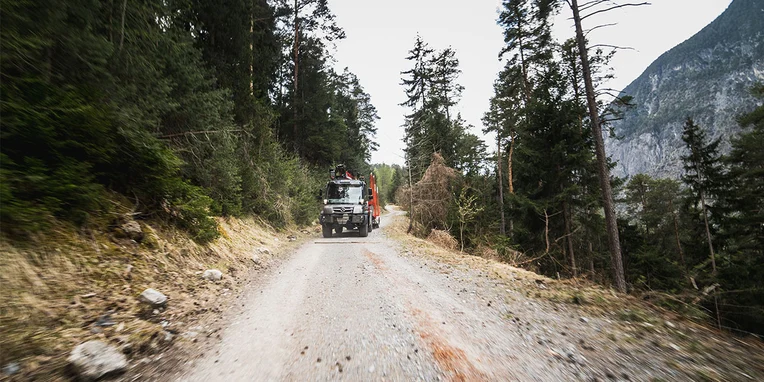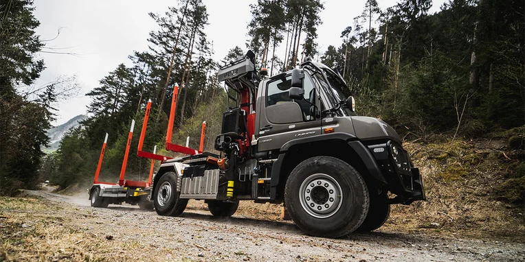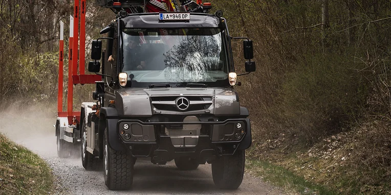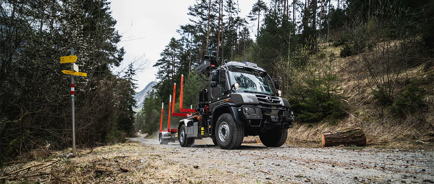 Soprattutto per gli interventi nei boschi, sui ripidi pendii delle montagne, in cui le strade salgono e scendono formando delle serpentine, la Gögl ha equipaggiato il veicolo con una sovrastruttura dotata di montanti. Il rimorchio è inoltre equipaggiato con un asse sterzante che gli consente di seguire precisamente la traiettoria dell’Unimog. Un sensore integrato nel perno di sterzaggio, il quale si innesta nel giunto a ralla, esegue una misurazione del movimento di sterzata della motrice e invia i dati rilevati direttamente all’asse del rimorchio, da dove il valore dell’angolo di sterzata viene trasmesso alle ruote. Il rimorchio può essere sterzato anche manualmente utilizzando un radiocomando: un sistema che offre vantaggi significativi durante le manovre. E per concludere, l’equipaggiamento comprende anche una telecamera per la retromarcia assistita e una telecamera supplementare per il monitoraggio degli attrezzi montati. I diversi fari di lavoro garantiscono un’ulteriore sicurezza durante le operazioni che richiedono l’utilizzo della gru.