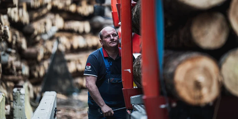 Gli scarti risultanti dalla lavorazione del legno nella segheria e nella carpenteria viene prodotto il cippato di legno. Per le operazioni di trasporto viene utilizzato il secondo semirimorchio, equipaggiato con un cassone scarrabile da 25 m³ e da un doppio asse tandem. Anche in questo semirimorchio entrambi gli assi sono provvisti di un sistema di sterzatura automatico. Il gancio della Palfinger, in grado di sollevare fino a 20 tonnellate, è montato direttamente sul cassone scarrabile.