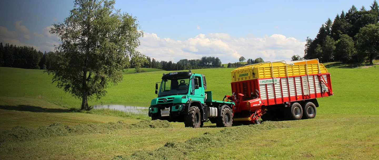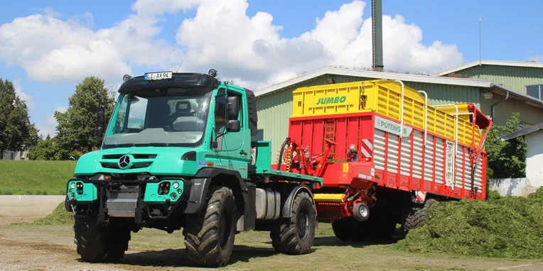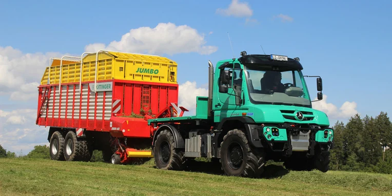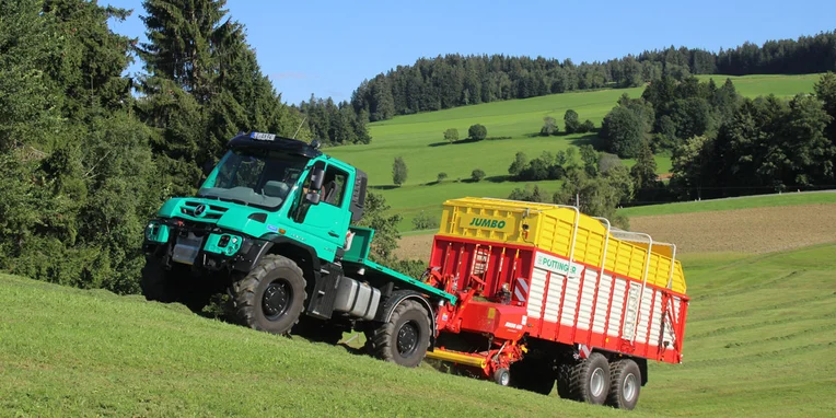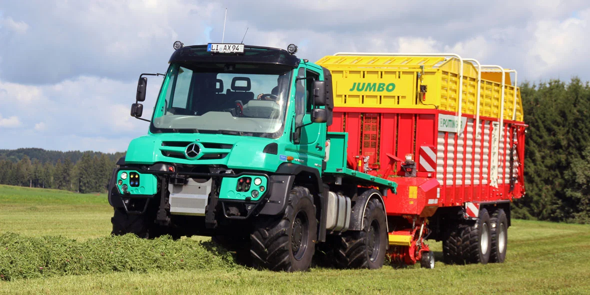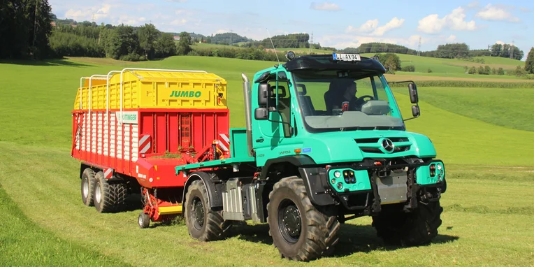 La stagione durante la quale viene utilizzato il 529 va da aprile fino a novembre. «Dopodiché viene messo in stand-by», spiega Toni Eller. Perché il suo nuovo Unimog ha un unico compito: lavorare. Oltre a ciò, ai membri che devono percorrere lunghe distanze per raggiungere l’impianto di essiccazione la cooperativa offre la possibilità di viaggiare con l’Unimog e di utilizzarlo per caricare l’erba e trasportarla fino all’impianto. L’Unimog U 529 è in grado di viaggiare a una velocità di 90 km/h e di trainare con disinvoltura il Jumbo, il caricatore della Pöttinger da 40 metri cubici.