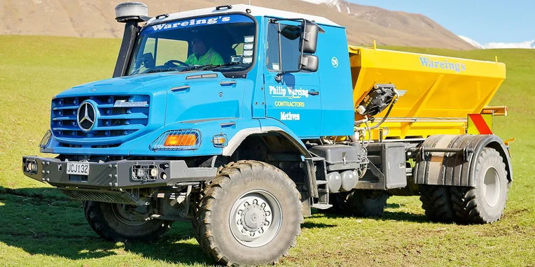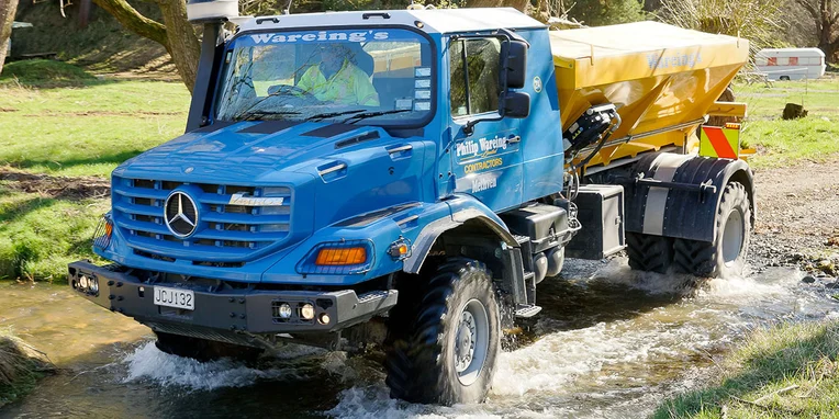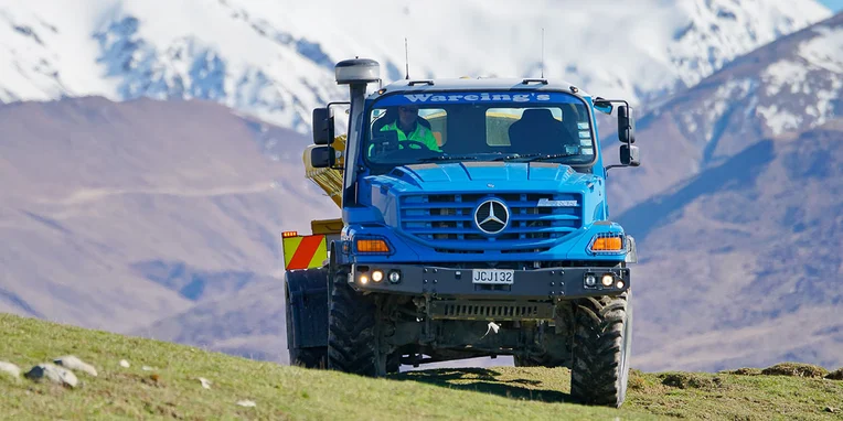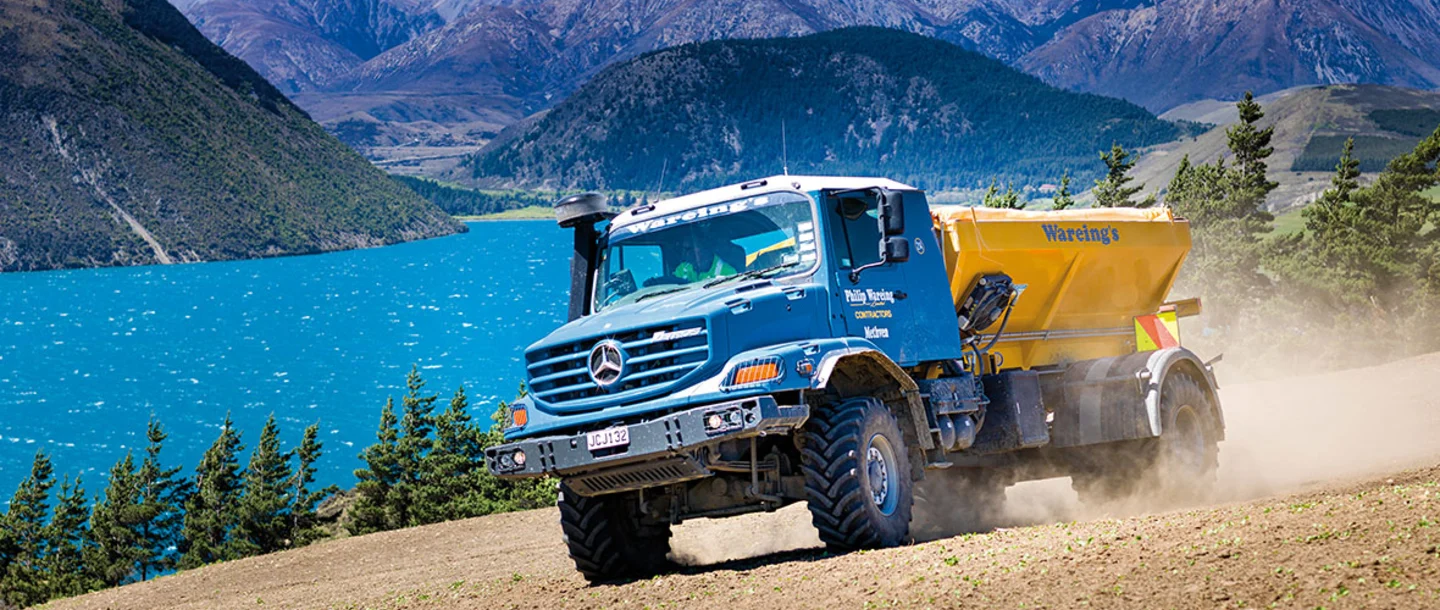 Da veri Kiwis, Philip Wareing e il suo team conoscono alla perfezione le ostilità dei terreni fuoristrada dell'Isola del Sud. Oltre alla sua incomparabile bellezza, il paesaggio è caratterizzato in particolare da strade ripide e sterrate che solo pochi autocarri sono in grado di percorrere. Nell'elenco dei migliori spicca il Mercedes-Benz Zetros, che grazie alle sue eccellenti doti fuoristradistiche è in grado di superare anche sfide estreme. Philip Wareing ha già accolto nella flotta della sua azienda contoterzista specializzata nello spandimento e nel trasporto dei fertilizzanti quattro di questi Special Truck dal cofano pronunciato.