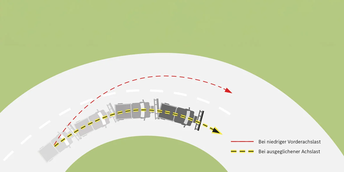 L'Unimog di Mercedes-Benz non sbanda neanche in caso di frenata a fondo. A questo provvede l'impianto frenante di servizio a due circuiti con freni a disco su tutte le ruote. L'ABS a quattro canali aiuta inoltre a mantenere il controllo del volante in situazioni di pericolo. Il rapporto bilanciato del carico sugli assi contribuisce a mantenere la stabilità in curva dell'Unimog, soprattutto su carreggiata sdrucciolevole. Il porta-attrezzi mantiene la traiettoria anche a pieno carico.