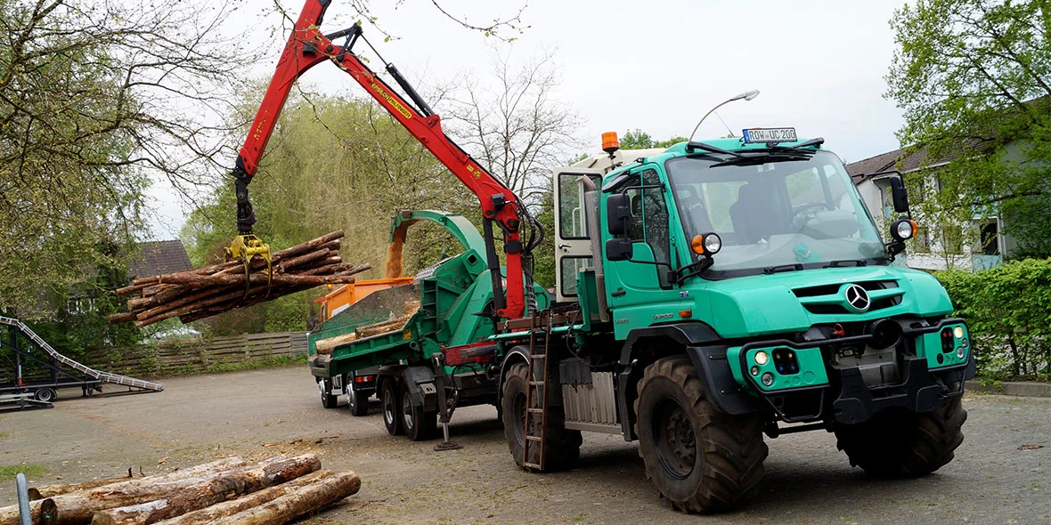 Sull'Unimog U 530 gli alberi delle prese di forza, anteriore e posteriore, erogano molta potenza per ottime prestazioni nell'uso di cippatrici e altri attrezzi.
